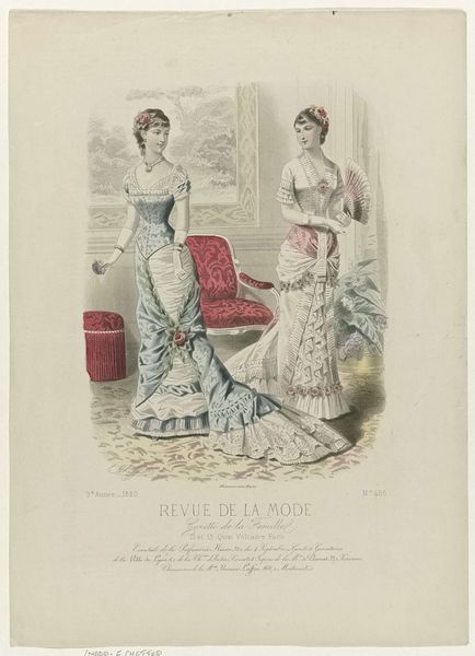 This is "Revue de la Mode, Gazette de la Famille", published in France in 1880 by A. Chaillot. The lithograph presents two figures adorned in fashionable dresses, set against a backdrop that implies a luxurious interior. The color palette, dominated by muted browns and blues, alongside the intricate detailing of ruffles and folds, immediately evoke a sense of opulence and refinement characteristic of the period. The composition is structured around the contrast between the dresses: The figure on the left with its dotted pattern and the figure on the right with linear stripes. The artist uses these patterns to define space and form, challenging conventional notions of surface and depth. The dresses, though decorative, serve as signifiers of social status, engaging with the semiotic system of fashion. The artist plays with texture and form to explore new ways of thinking about representation. It is through this careful construction that Chaillot invites us to consider how fashion functions as a visual language, communicating complex cultural codes and challenging established meanings of beauty and class.