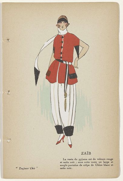 G-P. Joumard made this print called "Toujours Chic Les Robes, Hiver 1921-1922: Rouge-Gorge" using some kind of printmaking technique, probably a stencil. The colours are flat, like shapes cut out of paper. It's interesting how this simple process kind of echoes the actual process of making the clothes themselves, like a dressmaker's pattern. Look at the texture of the red areas. It’s smooth, almost velvety. But then you get these distinct, dark lines defining the edges of the outfit. It gives the whole image a graphic punch, a feeling of crispness and precision, which might reflect the style of the time. And the way the black fur trim is rendered, it's more like a dark mass, an abstract shape, than an attempt to depict actual fur. It makes me think of the post-war avant-garde and their embrace of abstraction. It reminds me a bit of Sonia Delaunay's work, who was similarly inspired by fashion and design. Ultimately, it's a beautiful object that invites us to consider the conversations between art, fashion, and the changing times.
