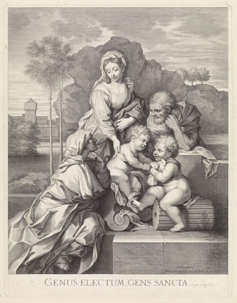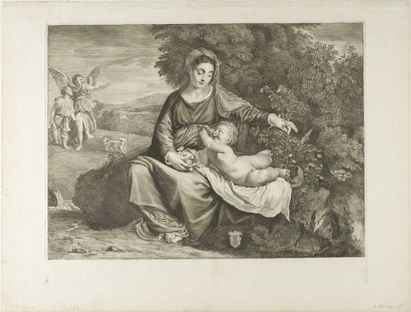 Editor: This is "Maria met Kind en drie engelen" by Alexander (II) Voet, created between 1662 and 1681. It's an engraving, currently held at the Rijksmuseum. The scene feels quite tender, with Mary and the Christ child surrounded by adoring angels offering fruit. What can you tell me about this piece? Curator: Well, situated within the Baroque period, we're looking at more than just a religious scene. The abundance of fruit and the fertile imagery speak volumes about societal expectations surrounding women and their roles as life-givers and nurturers. What strikes me is the inscription at the bottom, and its relationship to the rest of the composition. How do you understand it? Editor: I hadn't considered the inscription. It definitely shifts my perspective, makes it more… deliberate? More of a statement than just a pretty image. Curator: Exactly! This piece isn't just about piety, but also about power structures, expectations of female fertility and how women and children are presented as almost extensions of nature and sources of plenty. Look at the composition – how does Mary’s stillness contrast with the cherubs' offering, placing her in the center? It creates a fascinating commentary. Editor: I see what you mean. There's a stillness and strength about Mary, while the angels are very active and almost…performative in their offering of fruit. Curator: Indeed. Consider, too, the use of printmaking as a medium. Prints like these were widely circulated, making these idealized representations of motherhood and abundance accessible to a broad audience and shaping public perception of feminine ideals. Editor: That’s really interesting, to think about how reproductive labour and access could be influenced by artwork like this one. I'll definitely look at Baroque art differently now. Curator: Excellent, considering visual media's potential effect is half the battle when examining such pieces!