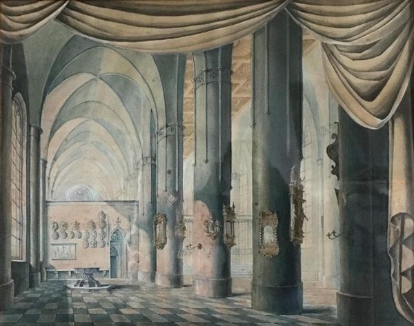 Editor: This watercolor painting, "View of the Ducal Palace in Venice," by Rudolf von Alt, was completed in 1874. It has a sepia-toned feel with lots of details in the architecture. What jumps out at you as you examine this piece? Curator: What strikes me most is the spatial organization and the interplay of light and shadow. Consider how the artist manipulates perspective. The foreground is rendered with intricate detail, progressively softening into the background. This creates depth, doesn’t it? Editor: Yes, it really does. The arches and columns lead your eye back. Curator: Precisely. Note how Alt employs a restricted palette, primarily earth tones. It’s very effective, calling our attention to the textural variation. Notice the sharp contrast between smooth stone surfaces and heavily decorated elements. What effect does this juxtaposition achieve, in your opinion? Editor: It emphasizes the ornateness, giving the building a sense of grandeur and age, maybe? Curator: An astute observation. The contrast in textures, along with light distribution, draws the eye up to the sculptures and ornate details. Are you picking up any suggestion that the figures occupying the portico appear secondary, almost integrated into the architectural backdrop? Editor: I hadn't thought of it that way, but yes, they're definitely part of the overall scene, not really the focus. More like extras on a movie set. Curator: This manipulation reinforces the principal subject, directing our attention back towards architectural form and decorative elaboration, right? Editor: Right! Seeing it this way really focuses my understanding. I was caught up in the details, but now the form and composition stand out much more. Thanks!