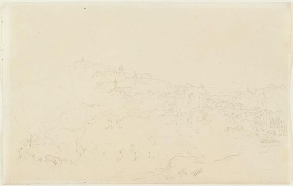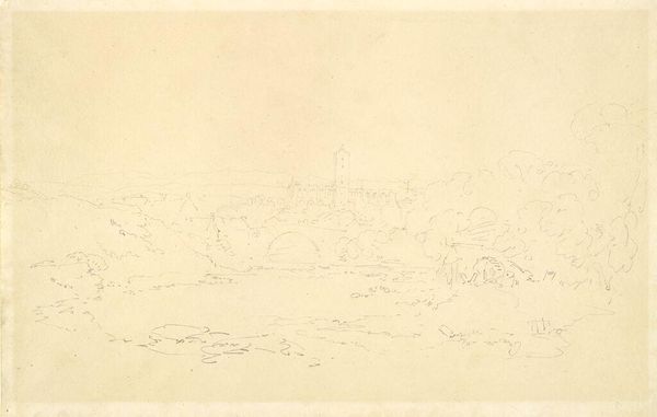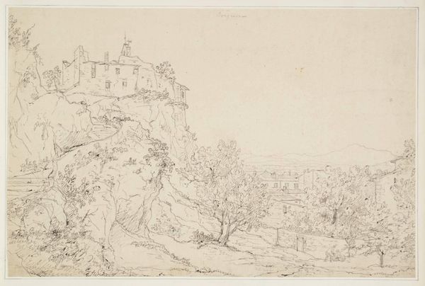 Curator: Before us is "Berglandschap," or "Mountain Landscape," a pencil drawing on paper by Leonaert Bramer, dating from around 1642 to 1653. Editor: There’s an ethereal quality to it. The pencil lines are so light, almost like a memory of a landscape rather than a depiction. A hilltop settlement in the distance...it feels distant and untouchable. Curator: The lightness reflects, in part, the nature of drawing as a preliminary, preparatory act. Drawings like these would have served various purposes in Bramer's studio. How the ready availability of drawing materials – pencils, various types of paper – shaped not only the landscape genre, but studio practice, workshops and eventually the market. Consider who supplied the paper, who made the pencils! These elements facilitated artistic production. Editor: That's interesting. For me, what resonates most is the implication of power inherent in landscape depiction. Who commissions these pieces? What political or social narratives do they convey to those consuming them? That hilltop settlement...is it being idealized or surveilled? Curator: I’d also point out how this piece exemplifies a loosening of artistic boundaries, moving between what might be viewed as ‘high’ and ‘low’ art. This is not necessarily destined to become an oil painting. Instead, the sketch has become an aesthetic object. The drawing itself becomes commodifiable, able to be circulated as is. Editor: Exactly, that touches upon the institutions facilitating or preventing that circulation: What role do galleries and private collections play? I can't help but ponder Bramer's position within Dutch society and how his artistry engaged with or challenged prevailing power structures. Curator: It invites us to look at what’s underpinning landscape art itself, beyond simple representation, and see how that changed with developing processes. Editor: It certainly does. Ultimately, I think "Berglandschap" leaves one contemplating not just the visible landscape, but the invisible societal forces that shaped its very perception and artistic rendition.