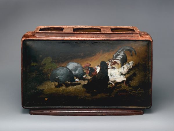 Curator: Look at this “Decorated Painter's Box” made sometime between 1640 and 1660. It's rendered in tempera on wood. It’s fascinating how artists of the Dutch Golden Age blurred the lines between the practical and the decorative. Editor: The monochromatic palette immediately strikes me – mostly blacks, grays, and whites. The limited color range gives it a stark, almost somber feel. What are we seeing depicted here? Curator: It features miniature paintings on all sides: battle scenes, landscapes. What's significant is thinking about the context – these aren't just aesthetic choices. Wood, tempera – these were materials readily available to many, indicating a potentially broader audience engaging with art-making, even outside the traditionally elite circles. It challenges the notion of art existing in a vacuum. Editor: The battle scenes are intriguing – they bring dynamism and tension to an otherwise functional object. It’s a container, yes, but the narrative painted onto its surface really draws the eye. It’s an object elevated by its intricate detail. Curator: Exactly. The creation of this piece undoubtedly involved labor, both in the carpentry of the box and the application of tempera. Thinking about workshop practices of the time, about the division of labor and apprenticeship models is crucial to understanding the final form. Editor: But aren't we still appreciating this object for its inherent qualities: the lines, the values, the rendering of figures in motion? It exemplifies skillful design, the careful use of contrasting light, which ultimately brings depth to a small scale, functional box. The narrative comes second; visual expression takes center stage. Curator: Well, by focusing only on formal qualities we would miss this piece as a possible product made for an artist reflecting and being engaged with their society by the means of using easily found material. But thinking through production and circulation really enriches our appreciation of what would otherwise just be seen as an art object for elites. Editor: I can definitely see value in understanding its societal role. Looking at its form and function gives an added appreciation, especially if thinking about the art box as a blank canvas for the artist who created it. Curator: I agree. Appreciating both the process and the finished art gives depth of knowledge that elevates how we think about such pieces from the Dutch Golden Age.