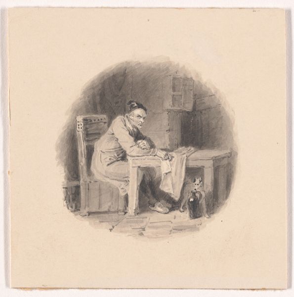 Curator: This is "Lezende man op een stoel voor een tafel met boeken" – or “Man reading in a chair at a table with books” – a lithograph from 1841 by Emile Montigneul. The artist has captured a very intimate and casual pose. Editor: Right! At first glance, it strikes me as… well, supremely bookish, almost to the point of being comically absorbed. The light catches him and that book like it's a stage spotlight, while those others pile up, waiting to be devoured. Curator: It’s interesting you say ‘comical’, because the lithographic medium in this period – especially for a portrait – suggests its accessibility, an image produced for mass distribution rather than, say, a formal commission destined for a private salon. There's almost a caricature at play. Editor: True, and there’s something subtly performative about his intensity. He is presenting himself in a visual spectacle as a true lover of books! I almost hear the rustle of paper and the turning of pages… but beyond that it makes me wonder, what story has captivated him? Curator: Well, it is curious. Consider the composition—the sharp diagonal of his leg juxtaposed with the receding lines of the table and those orderly arranged books suggest a careful consideration of spatial relations, which is not purely representational, it emphasizes his immersion. We also see him sitting down while most traditional portraiture puts people in a heroic pose. Editor: He's definitely claiming intellectual space with a confident slant that says, "Leave me to my thoughts." It’s funny – art often does this: an everyday subject presented in such a way as to force deeper reflection! Curator: Exactly. The texture too. The dense cross-hatching, giving form to clothing and shading to the face, plays an active part. It's about structure and an almost theatrical contrast between light and shadow. It would also highlight the technical prowess possible within the printing process itself. Editor: This makes you see art within the everyday, doesn’t it? Like pausing to note the stories in faces on the bus – those snatched moments of silent drama. To think Montigneul bottled that up on paper over a hundred and eighty years ago! Curator: Indeed! So many intricate layers subtly built into what looks like just another face.