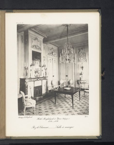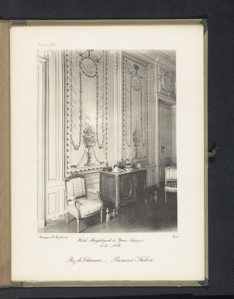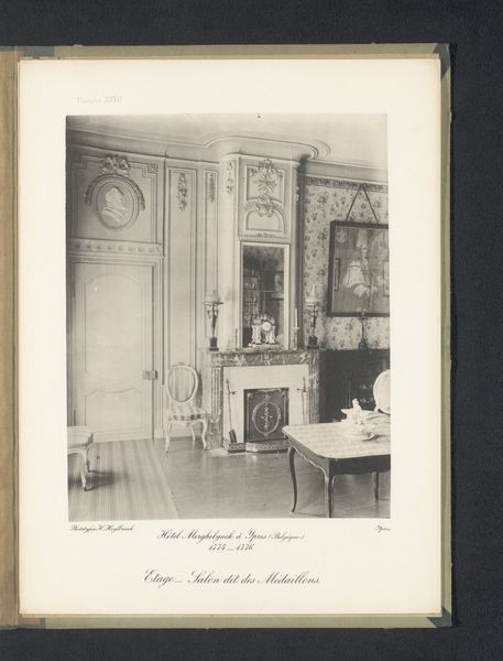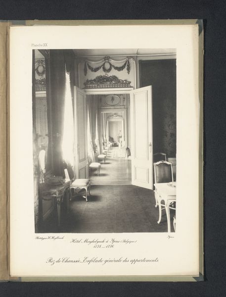 Curator: This photograph, "Zitgedeelte van een slaapkamer op de eerste verdieping van Hotel Merghelynck in Ieper, België," was captured by Hector Heylbroeck sometime before 1894. It's a fascinating glimpse into the past, wouldn’t you agree? Editor: It really is! I'm immediately struck by how serene and almost ethereal the space feels. It’s as if time has stood still. The soft light, the ornate detailing, it's all very dreamlike. How does the photographic medium influence your interpretation of this work? Curator: That's an astute observation. You see, photography at that time wasn’t just about documentation; it was also about creating an idealized vision. Heylbroeck seems to be consciously crafting a sense of refined elegance, almost theatrical. What’s really interesting is the use of light and shadow to emphasize the architectural details, making them appear both grand and intimate. Notice how the symmetry of the room almost echoes the symmetry in the photograph itself. Does it strike you as contrived or does it speak more to you of the period’s inherent elegance? Editor: I think it’s a bit of both, actually. It's staged, certainly, but beautifully so. Knowing it was taken before 1894 adds a layer of historical context that makes the image even more compelling. Curator: Exactly. The fact that it's a print also affects the tonality. What would now take seconds to see is an artificially-lit staging that would require the careful arrangement of people and objects, with very specific timings. One has to wonder who the photographer imagines visiting this place in its newly captured version. It's like an imagined memory already! Editor: That’s such an interesting perspective! I hadn't thought of it that way. Curator: Photographs often tell a story that has a little "us" in them too, don’t you think? I think it helps the viewer in trying to identify with that initial intention in the work itself. Editor: Absolutely. Looking at this image with fresh eyes, I’m starting to appreciate the subtleties I missed at first. It's much more than just a photograph; it's a window into another world.