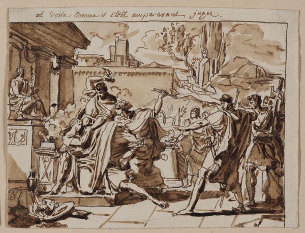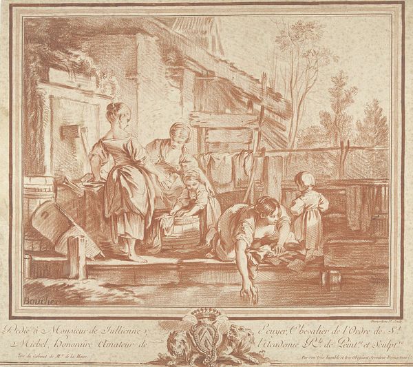 Curator: This is "Interior of a Military Chamber," an engraving, showing us a moment in the life of soldiers, probably by Baron Louis-Albert-Guillain Bacler d'Albe, though that remains unconfirmed. Editor: It's a fascinating scene, chaotic but somehow intimate. The sharp lines of the engraving give it a raw, almost journalistic feel. There's a definite tension between order and disorder here, isn't there? Curator: Absolutely. Look at how Bacler d'Albe details the accumulation of objects: the rifles stacked rigidly against the wall contrasting sharply with the haphazard arrangement of personal belongings on the shelf. And even how one soldier receives a rather crude haircut. It’s about labor, but also leisure. Editor: Those stark lines remind me of traditional depictions of sacrifice and honor in classical imagery, though turned upside down. Note the man in the center receiving his "wounds," though clearly not in battle. The visual language of glory repurposed for the mundane reality of military life. It reminds one that not all glory is bright. Curator: I think what the work reveals is how even within military structures, those rigid hierarchical lines become blurred. Consider the communal aspect of the activities. Even haircuts are turned into a public performance. One loses all sense of one’s material body when being shaved and dressed and so forth in public. Editor: Yes, the intimacy, like the haircutting and helping each other with the sheets—is definitely there, but there’s a layer of something darker in the visual language, don’t you think? The engraving gives us that heavy sense of the toll military life would demand. The weapons loom large, constantly present, even if unused in this moment. It also reveals the reality and the cost. Curator: Agreed. It seems less an idealization of military life and more a grounded observation of its multifaceted existence, highlighting the contrast of imposed discipline and lived reality, the equipment required to keep that going and the effect that it all has. Editor: It reminds us that these visual materials are not passive documents, they shape how we understand and remember history and what counts in the material experience. Curator: And for me, it showcases that careful dance between structure, control, labor, leisure, equipment and its inhabitants’ social negotiations. A story captured through lines. Editor: And through symbols laden with shared, yet subverted meaning, of shared visual memory about the costs involved.