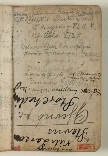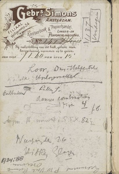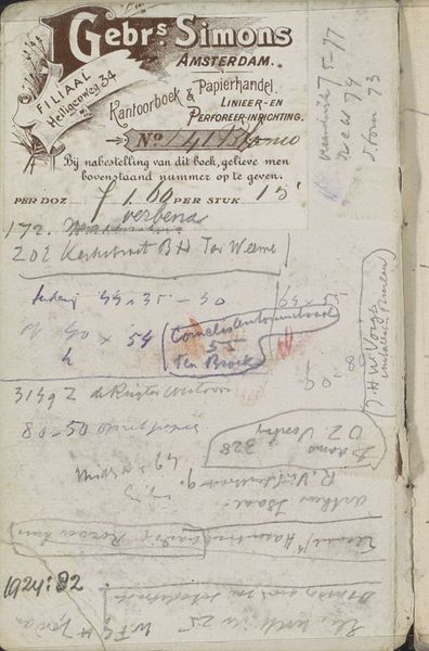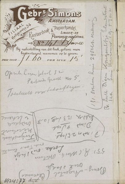 Editor: Right, next up we have 'Annotations', made between 1900 and 1923 by George Hendrik Breitner. It’s a mixed-media drawing, seemingly pencil on paper. There’s text scrawled all over the page, feels like a peek into someone’s messy notebook. What do you see in this piece? Curator: Ah, Breitner's ‘Annotations.’ For me, it's like stumbling upon a fascinating archaeological find! Breitner, the quintessential chronicler of Amsterdam, often used sketchbooks to capture fleeting moments, impressions that he’d later translate into his paintings and photographs. This page, though, is less about a finished work and more about the artist's raw thought process. See the layers of text and doodles. It’s almost like a palimpsest, revealing Breitner's many layers. What strikes you most about the handwritten elements? Editor: It's all so jumbled. There are addresses, scribbles... what does it all mean? Curator: Exactly! And perhaps the meaning isn't so much about deciphering every word but understanding the overall impression. Look at the "Gebrs Simons" logo – it gives us a sense of place, an Amsterdam paper merchant. The addresses – maybe London? Perhaps he jotted down an exhibition venue or a friend's location. It’s this constant travel between the personal and the public, isn’t it? Breitner capturing snippets from his life in real time! Does that resonate with you at all? Editor: Yeah, that makes sense. Like a very arty version of my to-do lists! It makes it feel very accessible. Curator: Precisely. It humanises the artist, doesn’t it? It’s not just about grand artistic statements, it's also the minutiae of daily life that fuel creativity. A beautiful glimpse into Breitner’s creative chaos. Editor: Definitely changed how I see this piece now, it’s much more personal than I initially thought. Curator: Exactly, sometimes it's the apparent chaos that unlocks the deepest connections, isn’t it?