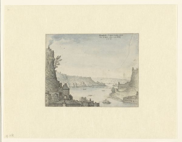 Editor: Here we have George Catlin's "Father Hennepin and Companions Passing Lover's Leap, April 1680," painted between 1847 and 1848 using watercolor. I find the multitude of canoes arranged in neat rows really striking. What do you see in this piece, especially concerning visual symbols? Curator: I am intrigued by the canoes and the cliff, as icons. The canoes represent the voyagers, and their placement hints at cultural exchange. Notice the procession; it echoes motifs of journeys found in diverse cultures and underscores the narrative of exploration and passage into the unknown. Now, what do you make of the geological formations—the cliffs themselves? Editor: They are monumental and awe-inspiring, seeming to watch over the travellers. They definitely dwarf the human figures, perhaps symbolizing the power of nature. Curator: Precisely. Cliffs are often read as symbols of strength, permanence, and the sublime. "Lover's Leap" adds another layer of meaning, layering romance, tragedy, and myth onto this geological icon. These natural formations have pre-existing, often indigenous, narratives attached. Catlin presents us with a complex interplay, right? It also begs us to examine his cultural viewpoint, his memory as it were, regarding the depicted event. Does he respect it, rewrite it? Editor: I hadn't considered that before, viewing it through that lens changes everything. The artist seems to use recognizable visual shorthand to tell the story, simplifying potentially complex history. Curator: Exactly! So, it also asks the viewer to actively participate in decoding his personal encoding. Are the symbols accessible or obfuscating, inviting curiosity, or discouraging conversation? Food for thought. Editor: This perspective on visual symbolism has opened a whole new avenue for understanding the artwork. Curator: I concur! Decoding images connects the past with the present, creating dialogues that span centuries.