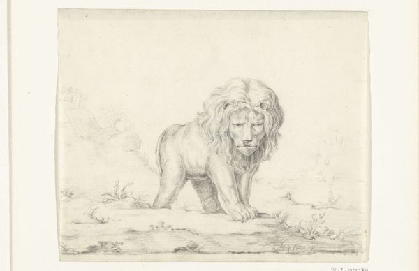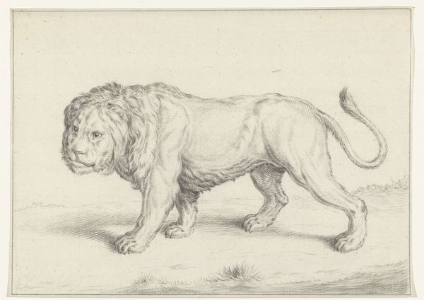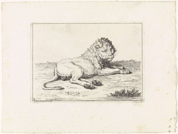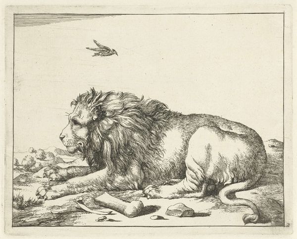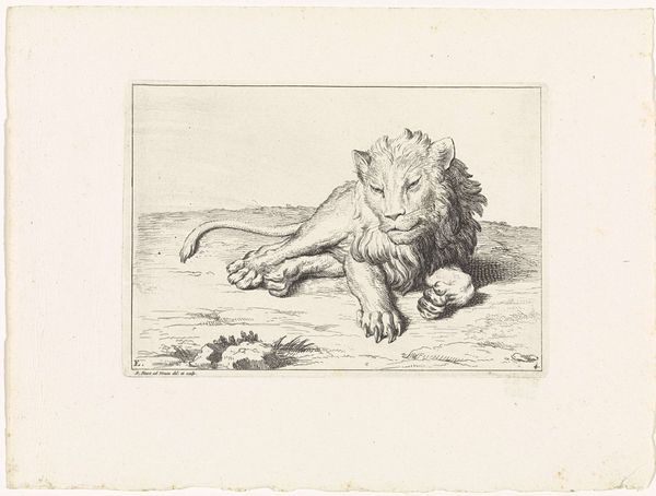 Editor: This is "Lion Seated by a Tree," an etching and engraving by Marcus de Bye from 1664, currently at the Rijksmuseum. I’m immediately struck by the lion's intense gaze; it’s both regal and a little unsettling. How do you interpret this work, especially considering its historical context? Curator: It's fascinating, isn't it? In the 17th century, the lion was a symbol of power and royalty, often associated with European aristocracy and colonial dominance. De Bye places this figure within a detailed landscape, complicating a straightforward reading of power. Notice how the lion, though majestic, seems somewhat confined by the print's dimensions and the dense environment. Does this juxtaposition of wildness and constraint offer a commentary on the limitations of power structures themselves? Editor: That's an interesting point! The way the lion is embedded within the landscape could suggest a more nuanced relationship with its environment, rather than just dominance over it. It almost seems as if the landscape itself is holding it. Curator: Exactly! Think about the context. The Dutch Golden Age saw intense debates around land ownership and exploitation as colonialism expanded. Perhaps de Bye's work subtly interrogates the human impact on the natural world and the moral ambiguities of claiming dominion. Could it also be a comment on the human condition? Editor: I see! So it is maybe less a straightforward symbol of authority and more an exploration of the responsibilities that come with it? This also shifts my understanding of the intense gaze from simple power to a burden or responsibility that the figure carries. Curator: Precisely. The beauty of art lies in its ability to pose questions, prompting us to re-evaluate historical power dynamics in relation to the natural world and humanity. Editor: Thanks, this really reshapes how I view this piece! I will have to explore the power dynamic in this new light going forward.