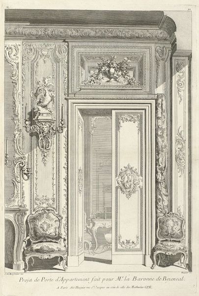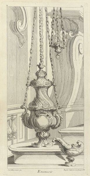 Editor: This is *Ontwerp voor een ornamentele windwijzer*, or Design for an Ornamental Weather Vane, dating from between 1738 and 1749, currently held at the Rijksmuseum. It’s a print by Gabriel Huquier… What a curious scene! It feels like I'm peering into a dream of ornate architectural whimsy. I wonder, what leaps out at you when you look at this? Curator: Well, for me, it's a playful dialogue between precision and fantasy. This design isn’t just about function, it’s a stage set for the elements! Think about the Baroque period, where ornamentation reigned supreme, and artisans like Huquier were essentially choreographers of space. Don't you feel a kind of theatrical exuberance in this almost over-the-top design? Editor: I see what you mean! The cherubs and the cascading water – it’s very dramatic. Is it purely decorative or would this have actually been a weather vane? Curator: That's the delightful ambiguity, isn’t it? It's entirely possible this was *intended* to be built; the detail is so precise, and you see practical joinery evident alongside pure artistic flourish. But perhaps the *idea* of the extravagant design was more compelling than its actual construction. Like a poem meant to be read aloud, versus one that is only pondered internally. Which form speaks most strongly to *you*? Editor: I guess the impracticality adds to the charm. Like a reminder that art can be about pure joy, not just utility. Curator: Precisely! And perhaps even a statement of status. It does beg the question what kind of winds a structure of this magnitude might actually resist! Editor: Definitely given me a fresh perspective on Baroque artistry and how even functional designs could be so wonderfully expressive! Curator: Indeed! And for me, it is a nice reminder that constraint encourages the most unique creativity.