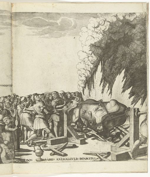 Nicolaas Hogenberg made this print, "Ox on the Spit," using engraving, a meticulous intaglio process. The image is built up from countless tiny lines cut into a copper plate. This was a painstaking activity, akin to a factory of labor, where skilled artisans were needed to render such fine detail. The density of the lines creates the illusion of form, texture, and even the heat rising from the roasting ox. See how Hogenberg uses hatching to define the animal's mass, and the crowd of onlookers. The print would have been made by inking the plate, then pressing it onto paper, a process that could be repeated many times over. The print medium was a way of disseminating images widely, and as such it was closely tied to the rise of both capitalism and scientific thinking. The roasting ox is depicted with great care and precision, as though for a zoological study. But ultimately, this artwork is about the labor required to convert nature into culture, sustenance, and spectacle.