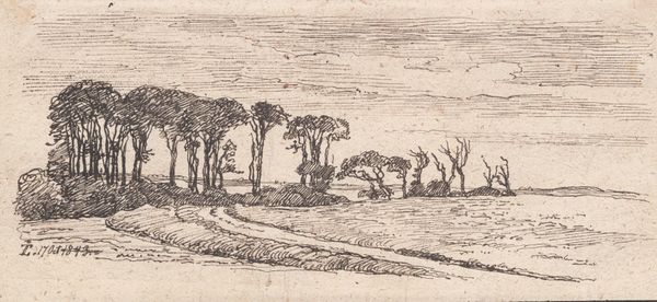 Editor: This etching by Alphonse Legros, entitled "Valley of Veronne," offers a remarkably serene landscape, don't you think? The details achieved through the intaglio process give the scene a palpable sense of depth, yet it feels somehow melancholy. What symbols or deeper narratives do you perceive in this composition? Curator: The Valley, especially as rendered here in this tonal subtlety, serves as a potent symbol of humanity's connection to nature and the cycles of life. Legros uses the image of the valley, in visual and symbolic terms, as the fertile and rich source that connects generations across time. The house nestled in the landscape—what do you make of it? Editor: It appears somewhat isolated, a humble dwelling. Perhaps it speaks to simplicity? Curator: Precisely! The dwelling might suggest a retreat from the complexities of modern life, or represent a desire to reconnect with the land and with agrarian, communal ways of life. The etching technique itself echoes that, harkening back to older modes of production and rural craftsmanship, connecting us, today, back through inherited histories. Editor: So the visual style almost reinforces the thematic content? Curator: Absolutely. And consider, too, that valleys have historically been sites of both refuge and conflict. The symbol therefore accumulates varied—and often contradictory—associations. The ‘melancholy’ you identified could stem from an awareness of this duality. It serves to deepen our experience, our shared understanding of those collective histories. Editor: I see how it encourages us to look beyond the immediately visible, exploring how place carries cultural meaning. Curator: Exactly. And how artistic practice helps bring that cultural memory into sharper focus. Editor: I will certainly carry those insights with me. Thank you. Curator: And thank you; your keen observations offered new perspectives for me, as well.