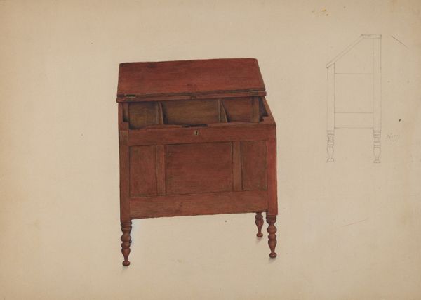 Edna Rex made this drawing of a desk, it's hard to say exactly when, and with what. The way the desk is drawn gives it this odd presence, a kind of uncanny familiarity, like a dream of a desk. I mean, it’s brown, right? A woody brown. And the shapes are pretty simple, but it’s also not really about the object itself. The perspective feels wonky, and I keep thinking about the process of drawing, the hand moving, trying to figure something out. Like, what does a desk even mean? The lines aren't precise, and the color is flat, which throws the whole thing into this weird, poetic space. The desk seems to float on the page, not really grounded, more like an idea. It reminds me of some of those early modernist drawings, Cezanne maybe, where they’re not just showing you something, they’re showing you how they’re seeing it. The whole drawing becomes about the act of looking. It’s this back-and-forth, push and pull that makes it so interesting.