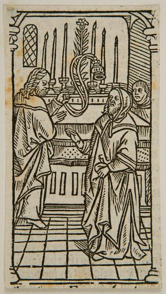Editor: Here we have an anonymous woodcut titled "Christ Cleanses the Temple." It's quite striking, a flurry of activity depicted with such simple lines. What do you see in this piece? Curator: The scene vibrates with a righteous anger, doesn't it? Consider the act itself: Christ overturning tables, a stark visual representation of spiritual corruption being purged. What resonates through time is the challenge to established norms, the questioning of what should be sacred. Editor: So, the image is less about the literal event and more about challenging established power? Curator: Precisely. The artist captures a moment of rebellion against institutional complacency. It's a potent symbol, echoing through generations whenever faith intersects with commerce. Editor: That’s a powerful way to interpret it. I’ll definitely look at similar works with new eyes. Curator: Symbols have a life of their own, don't they? They adapt and transform, but the underlying emotion often remains.