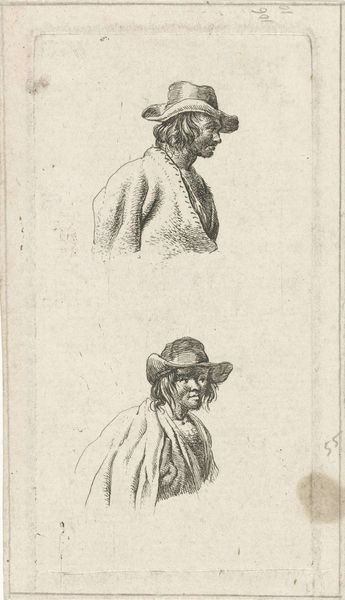 Curator: Here we have "To studiehoveder og en figur," which translates to "Two Study Heads and a Figure," created sometime between 1850 and 1899 by Lorenz Frølich. It’s currently held at the SMK, the Statens Museum for Kunst. Editor: Ah, my kind of controlled chaos! The immediate impression is one of... rumination, wouldn't you say? Three distinct character studies crammed onto the page, like souls trapped in amber, all rendered with a confident hand, but definitely from an artist’s sketchbook. Curator: Absolutely. It appears to be ink or pencil work, maybe even a print based on the fineness of the lines, exhibiting a dedication to draftsmanship characteristic of academic artistic training at the time. We see Frølich, who was a notable illustrator and painter, really wrestling with capturing archetypes. He had a career creating history paintings. Editor: Wrestling is right! Look at that fierce brow on the figure at the bottom—he’s practically a Zeus in miniature, though perhaps one who’s just misplaced his thunderbolt and is supremely annoyed about it. Meanwhile, the woman at the top has the placid sorrow of someone about to be painted as a weeping saint. This all does have a whiff of preparatory study, but for what? The stage perhaps? A particularly grumpy family portrait? Curator: It speaks volumes about the 19th-century artistic practice. Sketches like this acted as a form of visual note-taking, allowing the artist to explore a range of facial expressions and figure types to incorporate these studies into his narrative compositions, informed by classical ideals and historical research. Editor: I'm caught up with his confident crosshatching – he’s squeezing all this expression from pure, dense lines, and I think what intrigues me most is that we can almost feel the pressure of the pencil on the page. It's intimate in that sketchbook way, yet at the same time, distant in its ambition to depict some 'eternal' type. You’ve really got the earthy grandfather with his rebellious, if thinning, locks; the noble sage, with all of the signs of maturity marked on his wise face. I can just feel the wisdom. But then this kind, patient woman who is quietly reflecting… who is she and why is she here? Curator: Considering Frølich's prominent work with illustrations inspired by Nordic mythology and history, it wouldn't be farfetched to posit that he envisioned incorporating such figural characterisations into these grand depictions, aimed to educate the populace and instill a sense of national pride, reflecting both aesthetic conventions and didactic purpose. Editor: A propaganda tool... Now, doesn’t that burst our artistic bubble? In any case, thanks for sharing all that context; it’s certainly helped reveal a little more. Curator: And thank you for sharing your perspectives; it gives these sketches more presence and character.