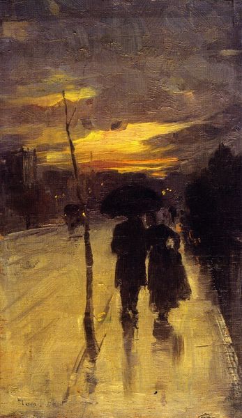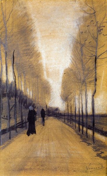 Editor: Here we have Vincent van Gogh’s "A Sunday in Eindhoven," painted in 1885. It's a watercolor painting, and it evokes a rather melancholic feeling for me. The figures seem to trudge through a damp, almost oppressive cityscape. What do you see in this piece? Curator: Oh, that's beautifully put! The melancholy seeps right through, doesn't it? What strikes me most is the light, or lack thereof. It's not the bright, joyous Sunday one might expect. It feels…stifled, like the promise of a day off is weighed down by the industrial surroundings. Do you get a sense of the figures being somewhat anonymous, almost lost in the scene? Editor: I do, now that you mention it. They're very small in comparison to the street and buildings, and their faces are obscured. It does make them feel anonymous. Curator: Precisely. And think about Van Gogh at this time, early in his career, deeply concerned with the lives of the working class. This isn't just a cityscape; it's a social commentary, a reflection on the drudgery of daily life even on a day meant for rest. That brown palette contributes, too, right? It almost suffocates the possibility of brightness. Editor: Absolutely, the limited color palette adds to that sense of gloom. It's almost like the colors are muted by the rain. Curator: It makes me think, what is “Sunday” for these people, really? It invites a poignant, uncomfortable conversation, doesn't it? Art that unsettles, art that makes us question – that's where the magic hides, wouldn't you agree? Editor: I agree. I initially saw it as simply bleak, but I now understand the social commentary and emotional depth. Thank you for opening my eyes! Curator: And thank you for yours! Art’s always a shared vision, a reflection bounced between the canvas and the soul, isn't it?