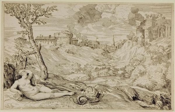 Editor: This is Cornelis Cort's "Rogero Liberating Angelica from the Dragon," created sometime in the 16th century. The dramatic rescue scene, rendered with such intricate detail, feels like a stage play. What's your interpretation? Curator: This print reflects the rising popularity of chivalric romances and the heroic ideal. Consider how Cort, through his masterful engraving, translates the grand narratives into a portable, reproducible format. Who do you think would have consumed this image and what meanings might they derive from it? Editor: It's fascinating to think about how accessibility changes the artwork's role. Thanks for highlighting the social aspect. Curator: Indeed, the image moves beyond mere representation to become a tool for disseminating cultural values and reinforcing social hierarchies. A true reflection of its time!