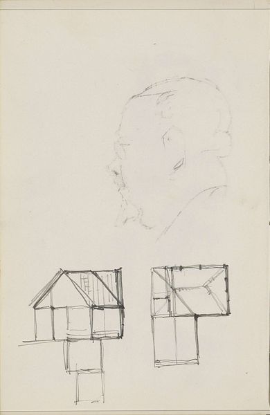 Curator: This drawing, simply titled "House on a Pol" comes to us from Vajda Lajos, created in 1936 using pencil on paper. The architectural precision, especially the superimposition of geometric forms, strikes me immediately. It feels both familiar and utterly alien. What’s your initial read? Editor: My first thought? Eerily precise. It's like staring at the ghost of a building. The skeletal lines, the near symmetry – it suggests a space that's perhaps been emptied of life, or maybe never held it in the first place. Curator: That's a fascinating take. I think Vajda's genius lies in that very tension. He merges reality, a very recognisable house, with these abstract geometrical frameworks. The triangles and intersecting lines are like symbols that cut through the surface and open a secret level to its meaning. I’m reminded of the merging of folk motifs with constructivist principles so prevalent in Hungarian art from that era. Editor: And those small triangles in the windows – almost hieroglyphic, aren't they? The artist is creating a personal, nearly hermetic system of signs. The shadow inside the window, and a blank in the second window, seems intentional too, contrasting clarity and obscurity. I wonder what these spaces hide, or maybe if the meaning of house, home or "Pol", an area, here transcends the purely physical... maybe represents collective memory or longing. Curator: Absolutely, these motifs pull at threads connecting collective unconscious to visual languages of the modernism. The 'House on a Pol’ is less a portrait of bricks and mortar, and more a window onto the architecture of memory itself. Editor: Yes, it feels less like documentation and more like an act of… divination. Like he is peering into the very idea of “home”. It is an echo with multiple, reverberating, symbolic possibilities. Curator: Ultimately, the work becomes a complex meditation of memory, form and personal mythology rendered in incredibly economic lines, doesn’t it? Editor: Indeed, a quiet yet forceful act of translating inner landscapes through deceptively simple marks.