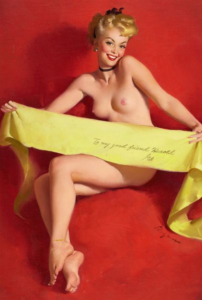 Gil Elvgren painted 'Golden Beauty' using oil on canvas, a traditional medium lending itself to the smooth, idealized forms characteristic of his pin-up style. The application of oil paint allows for the delicate blending of tones, essential in capturing the subtle gradations of light and shadow on the model's skin. Elvgren skillfully uses the fluidity of the paint to create a soft, almost dreamlike atmosphere, enhancing the allure of the scene. As a commercial artist, Elvgren was part of a highly developed production system, catering to popular taste and contributing to the burgeoning consumer culture of the mid-20th century. The seemingly effortless image belies the labor involved in its creation and distribution, from the model's pose to the printing and marketing processes. By appreciating the materials, techniques, and cultural context behind 'Golden Beauty,' we gain a deeper insight into the complex interplay between art, commerce, and the construction of desire in American society.