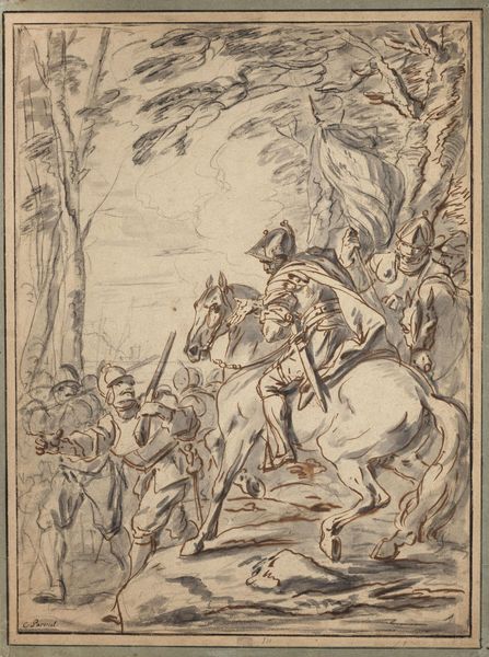 Curator: Immediately, there's a palpable sense of urgency and terror. The composition, with the looming figure and distressed women, throws me right into the heart of something awful. Editor: Indeed. What we're viewing here is "Greek Women and a Turkish Warrior," a drawing executed with pencil by Theodoor Schaepkens, dating sometime between 1825 and 1883. It's currently held at the Rijksmuseum. The theme firmly places it within historical painting, wouldn't you agree? Curator: Oh, absolutely. But there's also something wonderfully unhinged about it. The frantic lines, the almost cartoonish exaggeration of the Turk’s expression...it's less a document and more a nightmare rendered in pencil. I feel like the artist isn't necessarily trying to depict the events with precision. The artwork triggers within me the sense of the terror those women must have been in. Editor: I think you're right. We must see that the artist's intent isn't necessarily to faithfully capture historical events but rather to explore the power dynamics inherent in conflict and oppression. Think about it within the context of Orientalism and the 19th-century fascination with the "exotic" East, rife with power imbalances and stereotypes. The scene, drawn with such drama, reflects those colonial anxieties. Curator: You know, there’s a performative quality here, too. It's not just about the events, it's the story—the story someone *wants* to believe, perhaps to make sense of those imbalances. You see it in how theatrical the male figure is and his gesture… and perhaps the almost absurd anguish etched on their faces is intentional? Maybe to invite a sneer or to invoke that colonial gaze that, in fact, confirms biases and power dynamics? Editor: It's a narrative of dominance, constructed for a Western audience likely unfamiliar with or disinterested in the actual complexities of Greek-Ottoman relations. It's a visual tool of othering. Schaepkens paints them, their anxieties, their stereotypes. Curator: It really sticks in your craw, doesn’t it? Makes you question everything. Like looking into a historical mirror that reflects our present prejudices. Editor: Precisely. It invites us to confront the legacies of colonialism and power, reminding us how visual representations shape understanding. Curator: Yes, to not take anything at face value and continue looking beneath. Editor: An artist sketching their society.