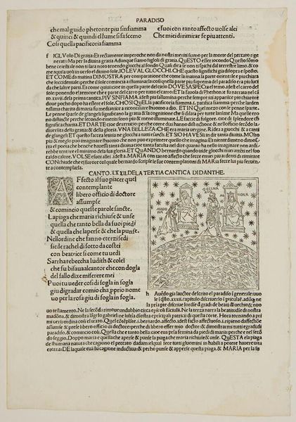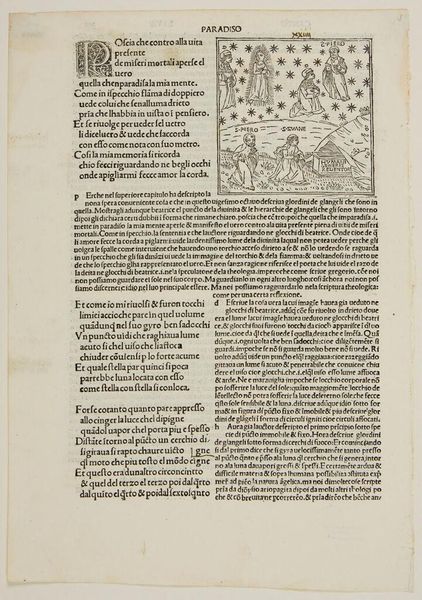 Curator: Here we have an intriguing print, "Canto XXIV. The Eighth Sphere: The Fixed Stars – The Triumph of Christ; Saint Peter Examines Dante on Faith." It's an anonymous work held at the Harvard Art Museums. Editor: It's fascinating how the artist combines the celestial and the earthly, all through this intricate network of lines. The figures seem so solemn, almost weighed down by their roles in this divine examination. It really gives me a sense of the material constraints that shaped art production. Look at the page itself: the letterpress next to the woodcut... Curator: Exactly. The print's creation, in this context, reveals much about the period's socio-political and institutional landscape. Consider how Dante's *Paradiso*, a text grappling with faith and divine order, is visualized and disseminated through printmaking. The medium itself participates in shaping public understanding. Editor: And it's fascinating how this medium allows for infinite reproduction. What's more interesting is how they mix celestial beings with commoners or workers here. Curator: Indeed, seeing the spread of this work is a means to understanding art's role as not just aesthetic objects, but also as carriers of cultural and spiritual meaning, impacting societies. Editor: It all comes together – the labor, the material, and the meaning! Curator: A testament to the power of art to reflect and shape the beliefs of its time.