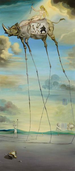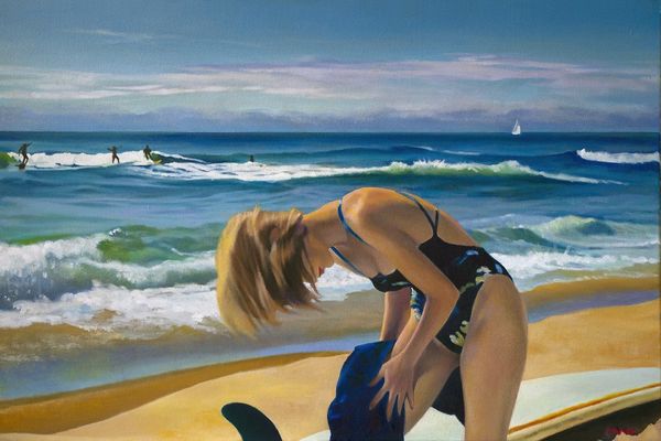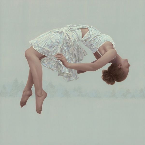 Curator: This piece is "The Swing" by Bo Bartlett, created in 2017 using acrylic paint. The solitary figure immediately evokes contemplation. Editor: It certainly does. The chromatic range seems deliberately restrained, lending it a melancholy quality. Note how the subtle shift in value within the sky generates a depth that's almost unsettling. Curator: The figure, a girl on a swing, is positioned with her back to us. It places the viewer outside her subjective experience while, simultaneously, it prompts our empathetic engagement. We're implicated in her apparent quiet solitude as viewers, but this figure existing in isolation speaks to the issues facing young women today; she seems burdened by a quiet despair. The backdrop, with the horizon barely a sliver, furthers this effect, does it not? The sea is rough but constrained by compositional decisions, just like the young woman's freedom. Editor: Interesting take, though I am drawn to the texture Bartlett coaxes from the acrylic. See the way he manipulates the medium to create almost photographic detail on the subject’s jacket, contrasted against broad planes elsewhere? It establishes a captivating interplay between realism and artifice. Even the rope, though realistically depicted, cuts starkly across that cerulean expanse like lines in a geometrical composition. Curator: Yes, that’s undeniable. It’s interesting to view this not as artifice so much as the constructed nature of girlhood itself. The denim jacket feels deliberately chosen as an attempt at agency even while that same agency feels circumscribed. Consider, too, the very deliberate way her bare legs invite the viewers' gaze: an impossible invitation extended only within patriarchal culture. Even her brown hair can be symbolic as representing both the color of the earth as a way of situating young girls to nature, but this falls apart since the swing keeps the woman elevated. It seems this is also the site of tension. Editor: I confess my interest remains anchored in the technical mastery. Bartlett so deftly balances abstraction and representation. Observe how the setting sun kisses the horizon line and warms her skin. And from a structural viewpoint, how those angular ropes cut through and destabilize what would otherwise be a too-comforting and calm tonalist arrangement. Curator: True, and by situating this painting within contemporary and historical analyses, we gain a sharper awareness of current experiences while we, too, question where this moment positions us. Editor: Ultimately, an evocative convergence of material and method to challenge our gaze.