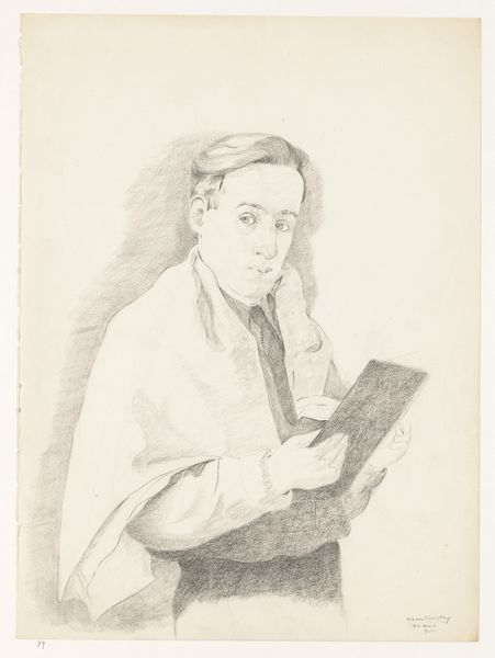 Curator: This portrait drawing, titled "Adolf Zimmermann," dates back to 1828 and is attributed to Carl Oesterley. What strikes you first about this piece? Editor: The understated elegance, definitely. It's a pencil drawing, almost a sketch, yet it possesses this incredible level of detail and precision, especially in the subject’s expression and the rendering of his clothing. It feels intimate, almost as if we are intruding upon a private moment. Curator: That intimacy is heightened by the artistic conventions of the Romantic era. Consider the burgeoning interest in the individual and emotional expression during this period, Oesterley’s drawing certainly reflects that cultural focus. Editor: And it makes you think about the tools he would have had at his disposal. Just pencil and paper. Think of the preparation involved: the making of the pencil itself, the sourcing of the paper. It brings you back to the fundamentals of artmaking. Were drawings such as these often preparatory studies? Curator: Often, yes. In 19th century Europe portraiture was an important status symbol, particularly among the rising middle class. This may have been preparatory work for a larger, more formal painting. Also think of the art academies, where young artists perfected their technique. Drawings like this were very important for them. Editor: And the materials speak to a particular kind of accessibility, right? Unlike oil paints and canvas, pencil and paper are relatively inexpensive. I'm wondering about the sitter: who was Adolf Zimmermann? His clothing suggests someone of status. Curator: Research indicates that he was a landscape painter. Now forgotten by history but there were hundreds like him at the time. Editor: The details certainly invite speculation. The hat seems soft and well-worn, and it is skillfully captured through layering of graphite strokes. It reminds us of the humanity of artistic representation, its dependence on skilled labor. Curator: A lovely reminder that every image, no matter how simple, is rooted in the socio-economic context of its time, its own form of industry and aspiration. Editor: Yes, that consideration of process and raw material really shifted my perspective. Thanks.