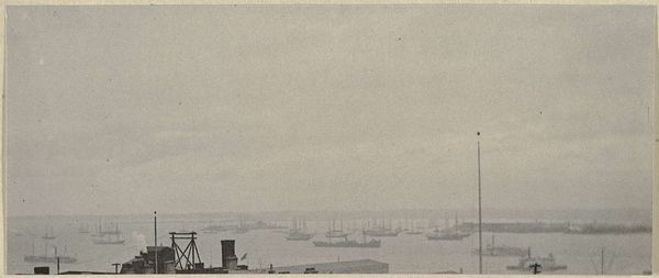 Editor: This is Alexander Gardner’s "Naval Blockade," a gelatin-silver print from 1865. The arrangement of ships fading into the horizon really emphasizes the vastness of the sea and the scale of the blockade itself. What catches your eye when you look at this? Curator: The starkness of the image really draws me in. Think about the chemistry involved, the processing of light on silver halides, to produce such a muted but detailed image. Gardner's choice of the gelatin-silver process is interesting, placing emphasis on the replicability of this scene for mass consumption. These prints, as commodities, played a huge role in shaping public perception of the Civil War. Do you see how the composition enhances this? Editor: Yes, now that you mention the production, it definitely highlights how photography could distribute and almost commodify images of war to the broader public, but replicability wasn't unique to photography at the time. Curator: Absolutely, but consider the speed and "accuracy" that photography provided compared to other reproductive media such as engravings. Gardner used photography's perceived objectivity to create seemingly unmediated access to the conflict. This challenges the tradition of history painting, doesn’t it? Where are the heroic narratives or allegorical figures? Editor: It really makes you think about how the technology influenced how war was understood. It's not some glorious painting; it is an attempt at realistic documentation distributed at scale. I suppose before this conversation I thought only about the imagery and message itself. Now the means of creating the message really makes me wonder who the work was created and sold for, too. Curator: Exactly! We often forget that art doesn't exist in a vacuum, right? Editor: Right! Thanks; that helps to put this piece into perspective.