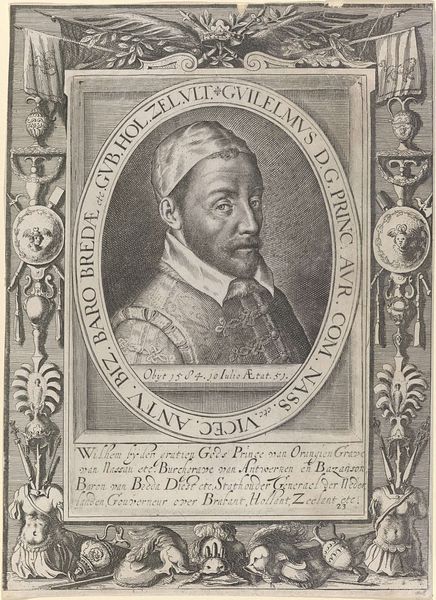 Editor: Here we have Jan Baptist Jongelinx's "Portret van Johannes Hauchinus," created sometime between 1710 and 1725, using engraving on metal. It strikes me as quite formal, almost austere in its presentation. What do you make of it? Curator: Well, the portrait immediately speaks to the sitter's status. The cartouche displays a coat of arms, a visual shortcut communicating power, lineage, and perhaps even divine right. Do you recognize the hat depicted above the shield? Editor: It looks like... a bishop's hat? Curator: Precisely. Now, observe the placement of this coat of arms beneath the portrait itself. How does that visual arrangement inform our understanding of the individual? Editor: It seems to emphasize his authority, like it's foundational to his identity. I guess that’s the historical context coming through – a visual statement about the power structures of the time? Curator: Exactly! Jongelinx uses this visual vocabulary to reinforce the idea of inherent authority and divine sanction. Note the deliberate inclusion of Latin text too. Editor: The inscription mentioning his role as Archbishop…It's like he’s reinforcing the legitimacy and the timelessness of this authority. Curator: Indeed. By connecting the individual to enduring symbols and tradition, Jongelinx ensures his subject's place in cultural memory. Are there other repeating shapes or forms that connect figure and frame? Editor: Oh! The oval around his head is mirrored in the shape of the coat of arms. They work together. Curator: An astute observation! What have we discovered? How might viewers at the time interpret this? Editor: I think it served as both a record of his existence and a reinforcement of the power and prestige tied to his position in the Church. Curator: A fascinating piece revealing a specific kind of cultural continuity through symbolic representation. I learned a great deal from your observation about repeated shapes.