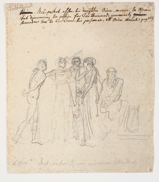 Curator: This pen and ink drawing, "Schets van vier schilderijen" by Jurriaan Andriessen, dating from 1777, presents an interesting puzzle. It's held at the Rijksmuseum. What are your initial thoughts about this work? Editor: It’s quite a curious sheet, isn’t it? Almost like a comic strip with these four scenes sketched out. They feel very theatrical and staged, perhaps reflecting popular entertainment. What exactly do you see here? Curator: Well, the pen and ink work immediately directs us to the labour involved in production. It wasn't just about spontaneous creation, but a considered exercise in visualising larger narratives, we see in the inscriptions too an interesting perspective on sale value. Think about the paper itself - its cost, its source, the labour involved in making it available to the artist. Then think about the purpose of a sketch like this. Was it preparatory for a painting? Was it a means of marketing a theatrical production? It becomes interesting when you start unpacking all the labor invested in production. Editor: I never considered it that way, breaking down the stages of making art accessible! So, would you say that this work then critiques the high art versus craft divide through highlighting labor? Curator: Precisely! Consider Andriessen’s social context, a period undergoing shifts in artisanal labor practices and consumption patterns. By showcasing the process – the sketch, the 'raw' idea - he collapses the distinction between refined artistic output and the hands-on creation, he focuses the value away from just the art and more into the material involved in producing the art piece. Editor: I am not sure that this challenges artistic production as a whole; It feels more illustrative and representational. Curator: Indeed. What initially appears to be a set of individual works can be seen as part of a cycle of artistic, and even social, production. Editor: That is helpful. Now, thinking about materials and their value makes me look at the artwork quite differently. Curator: Glad to provide an eye opening prospective, I've learnt some more myself about material context.
