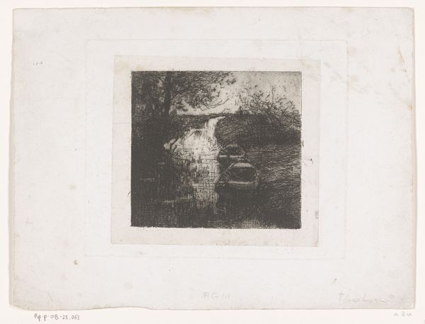 Curator: Emile de Baré's "Nachtgezicht op een rivier," or "Night View of a River," made between 1865 and 1902, captures a tranquil waterside scene. Editor: There’s a real stillness in this image. The monochromatic palette and the soft etching technique lend it a quiet, almost melancholic mood. Curator: Considering the likely plein-air method of the piece, let’s think about the culture in which artists, mainly male, positioned themselves to witness the "authentic" or natural settings removed from social or political chaos. How does the "authenticity" intersect with contemporary class dynamics? Editor: Right, and how accessible was this landscape for those caught in the cogs of industrial labour? The etcher’s tools and materials allowed him to represent a scene reflective of a specific socio-economic perspective. Were laborers invited in its making? I doubt it. The scene feels very curated for particular eyes. Curator: And within that curatorial impulse, notice how the composition frames a specific vision of nocturnal peace. There’s a conscious positioning here: the placement of those soft watercolor illustrations of lighted posts; that strategic placement of the barely noticeable windmill off in the distance. Editor: I’m particularly drawn to the ink itself. The etching process reveals labor, the controlled, almost meditative repetition required. Curator: That laborious technique highlights the artist's mastery, while also echoing the tireless industrial machinery that would have dominated urban existence at the time. De Baré has chosen here, instead, to focus on the absence of such clamor and mark-making. Editor: What about the role of this print's reproduction, though? An etching such as this could find wider consumption than a unique watercolor illustration and therefore extend de Bare’s intended viewing context further than perhaps he could have at all dreamed. Curator: Exactly! So, we're looking at how representations of landscapes are made, and whom they are intended to serve both socially and ideologically. Editor: Absolutely, and understanding the materials, process and mode of reproduction informs that critique, highlighting what gets prioritized and whose perspective dominates. Curator: Considering how it intersects with both the historical and the contemporary gives such potency to de Baré’s piece. Editor: Indeed, I came here hoping to see an ethereal moment; I leave considering who *gets* that ethereal moment.