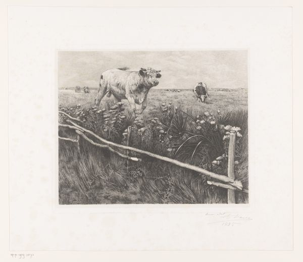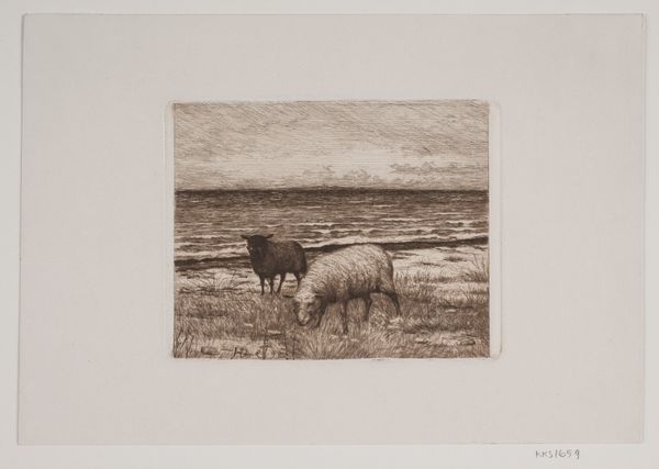 Editor: Here we have "Herder met kudde schapen," or "Shepherd with a Flock of Sheep," possibly from 1889, an etching by Elias Stark held at the Rijksmuseum. The scene feels quite stark actually, rendered in these very fine lines. It's interesting to see a rural scene depicted through printmaking. What do you notice in this piece? Curator: I'm immediately drawn to the materiality of this print. Etching, as a reproductive medium, allowed for the democratization of images of rural labor. It removes the direct hand of the artist somewhat. Consider the societal implications: this scene, once only accessible perhaps as a unique painting for the wealthy, is now made available more widely through the printmaking process. Editor: So, you’re saying the *method* of creating the artwork impacts how it’s received? Curator: Precisely. And consider the social context. Late 19th century. Industrialization is pulling people to cities, yet we see here this enduring image of pastoral life. How might the target audience – potentially an urban middle class – have consumed this image? Was it a romanticization of a life they no longer lived, a commentary on their relationship to the land, or perhaps simply decoration? The sheep, too, are a commodity, sources of wool for clothing and textiles. Editor: That makes me consider the economics of the art itself. The etching process, while more accessible, still involved labor and specialized skill. And, the paper has value. Curator: Exactly. Every step of its production connects to systems of labor and exchange. By focusing on those material elements we shift our attention away from traditional art historical concerns like authorial intention or subjective feeling, towards a more grounded understanding of how art functions within social structures. Editor: I hadn't considered all of those layers when just looking at the sheep. I’ll definitely pay more attention to the materials used from now on. Curator: Indeed. Understanding art's material origins provides richer context and questions long held notions.