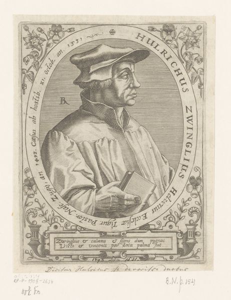 Editor: Here we have Theodor de Bry's "Portret van Johannes de Imola," an engraving from around 1597-1599, held at the Rijksmuseum. There's a real sense of Renaissance swagger, even bordering on caricature in his features. What catches your eye in this portrait? Curator: The enduring symbols surrounding Johannes speak volumes. Notice the bees, traditionally representing industry, diligence, and civic virtue, combined with floral motifs suggesting a flourishing life, both personal and professional. They highlight the cultural aspiration of associating individuals with positive societal values. How do these symbols change your reading of his character? Editor: They do soften the impression, somewhat. I initially saw the strong features and elaborate clothing as ostentatious, but the bees suggest something more than mere vanity. What about the inscription? Curator: Indeed. The Latin phrase translates to "If grace follows well-digested laws, then a civic palm will come to your titles." So, De Bry visually encapsulates his status through symbolic language tied to justice, civic duty and success; all anchored in Roman virtue. It speaks to an interesting, visual form of historical record. Is the weight and density of symbols like these what draw you in to study art history? Editor: Yes, exactly! I am really intrigued by how much a single image from the past, like this engraving, can reveal about cultural values of its time. I think I understand a little more about portraiture's relationship with cultural memory and continuity now.