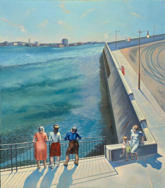 Bo Bartlett made this painting, Longshoremen, with oils, and right away, I'm struck by how the colours and the surface create a sense of watching something unfold rather than presenting a complete picture. It’s fascinating how Bartlett’s brushwork dances between detailed realism and blurry uncertainty. The faces in the foreground are rendered with such clarity, yet they seem to fade into the hazy, almost dreamlike background of shipping containers and towering cranes. Look at the way Bartlett handles the light on the older man’s face, each stroke seems to model the planes and volumes so precisely, but the rest of the figure remains somehow lost in shadow, almost dissolving into the atmosphere. This reminds me of Luc Tuymans and his way of using muted colors to make paintings that feel both familiar and distant. Like Tuymans, Bartlett’s work reminds us that painting isn’t about perfect representation, but about opening up spaces for ambiguity and multiple readings.