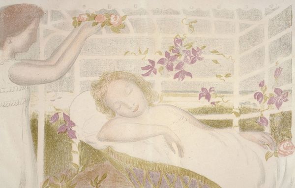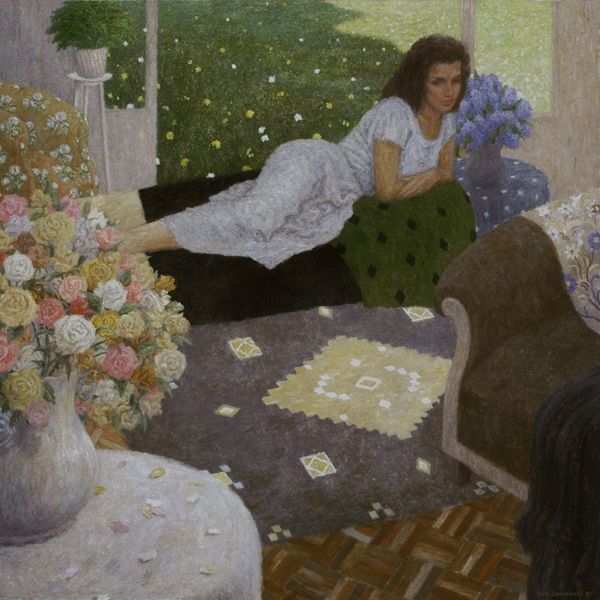 Editor: Looking at this work, titled "Green River" by Iwo Zaniewski, which appears to be an undated watercolor, I'm immediately struck by how the intimate scene feels both familiar and distant. All those floral patterns create such a layered effect, almost concealing the figure within. How do you interpret this piece? Curator: The first thing that captures my eye is how Zaniewski uses this enclosed, almost claustrophobic space to explore themes of isolation and contemplation. Consider the pose of the nude figure: turned away, gazing outwards, yet seemingly trapped by the interior. What emotions do you think the artist is conveying through this deliberate visual arrangement? Editor: That feeling of entrapment resonates! Perhaps the floral motifs symbolize societal expectations or even the confines of domesticity, binding the figure? Curator: Precisely! Flowers, often symbols of beauty and fragility, become a kind of camouflage, blending the figure into the environment. Do you think the green river connects the exterior world with that internal reality of being closed-off? Editor: I do, and that's interesting. It's like the figure can look at that scene outside of that window, but it is still separate. The vibrant life versus the closed interior... Curator: Yes, and watercolours as medium lend themselves to depicting themes of introspection, where emotional experience flows or pools over surfaces, inviting us to find and name the emotion. The title provides a possible clue, and adds yet another layer for potential discovery. Editor: I hadn't thought about how the title played into it so specifically, almost beckoning me toward discovery through a particular lens. This piece feels much richer now. Curator: Visual analysis provides clues to interpreting the piece; now we seek to further expand meaning through symbols and cultural context. "Green River," as with much art, exists beyond what the immediate image shows.