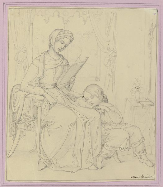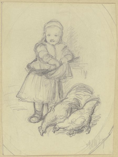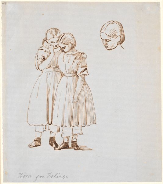 Curator: Marie Ellenrieder's 1831 pencil drawing, "Two small girls," captures a seemingly intimate, yet fleeting, moment. It is currently housed here at the Städel Museum. Editor: My first impression is a sense of delicate stillness, almost as if the artist were afraid of breathing too heavily lest the scene dissolve. It’s a study in bareness. What's holding them together, literally and figuratively? Curator: Ellenrieder, unique amongst the Nazarenes for being female, imbues even simple scenes with deep affection and empathy, reflecting the values of early 19th-century Romanticism while engaging in her personal dialogue with faith and femininity. The medium here, just a simple pencil drawing on paper, emphasizes the girls’ unadorned innocence. Editor: But is that all? Innocence feels too easy, here. I’m wondering about access to materials, about the cost of pigments at the time and the way sketching was—still is, arguably—a readily available mode of art production accessible regardless of wealth. And these dresses... their rough textile make-up, possibly linen, are so typical to that era. Curator: Ah, a good reminder to ground us, so to speak. The paper is noticeably textured as well, almost like rough fabric, adding to that materiality you mentioned and influencing the subtlety of her mark-making. It's all whispery. It gives an ethereal feeling. But what do you see in their gesture and proximity? Editor: I notice labor reflected through process: the repetitive mark-making involved in creating shadows, and the visible build-up of those marks shaping their bodies, their stance, as if slowly breathing life into them through repetitive touch and pressure on the pencil itself. There’s a tenderness in that action. Curator: And do you find that the genre, portraiture, can provide the tools for female artists, then and now, to push societal perceptions of womanhood and artistic value, by depicting an actual intimate moment between siblings? Editor: Absolutely, it brings to light how the domestic sphere—considered women’s domain—became fertile ground for observations and challenges regarding traditional hierarchy within the art world. "Two small girls" showcases the subversive potential inherent within humble, everyday subjects. It certainly transcends simple depictions of youthful virtue, even then, don’t you think? Curator: Absolutely. Reflecting on our discussion, it is remarkable to discover how much quiet dialogue resides within such a deceptively simple composition on paper. Editor: I agree, this brief exchange makes me wonder about art's continuing dialogue, not just with its past, but within present structures of material and access, echoing softly with untold implications even now.