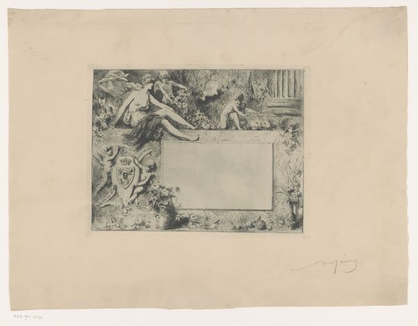 Editor: This is Félicien Rops's "Frontispiece to La messe de Gnide," an etching done in 1881, printed on paper. The figures seem trapped, tangled almost, in a delicate yet decadent scene. What's your perspective on this etching? Curator: Focusing on the material and processes, consider the labour involved in creating such a detailed etching. The fine lines, the tonal gradations achieved through controlled biting of the metal plate by acid – all point to a skilled craftsman deeply engaged in the physical act of making. But this labour is placed in service of depicting leisure, eroticism, and perhaps a critique of societal norms around desire. Editor: So, you’re seeing a tension between the means of production and the image itself? The artist working hard to create an image of… not working? Curator: Exactly. How does the reproductive nature of printmaking affect the value or meaning of the work? Is it elevated by being collected, framed, and displayed here, divorced from the more immediate and perhaps subversive context for which it was intended? Editor: Interesting. I hadn’t thought about that tension between the process and the content, or how it changes by being in a museum. Is Rops commenting on the commodification of pleasure? Curator: Possibly. Etchings were often created for a market; this wasn’t necessarily intended as high art, but as something circulated, consumed. The erotic themes certainly speak to a particular, potentially subversive, market and its appetite. We must ask ourselves who commissioned and consumed these images and why? What kind of social rituals or economic exchanges did these prints enable? Editor: That gives me a new way to think about the artist's choices of materials. Thanks! Curator: Indeed! By focusing on the materiality and means of production, we see not just an image, but a nexus of social, economic, and cultural forces at play.