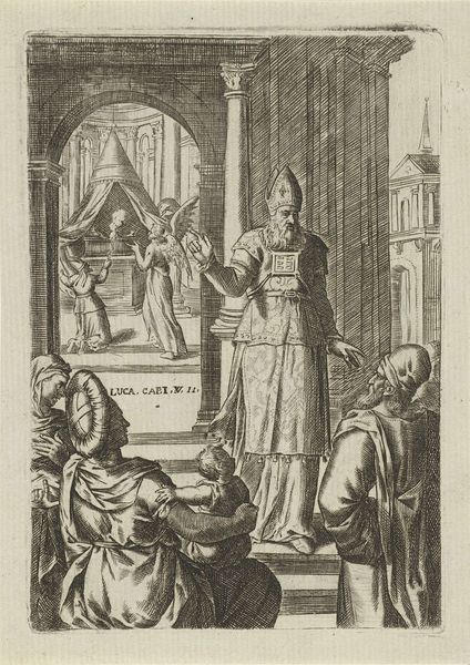 Editor: So, this is an engraving titled "Philosophers and Astronomers," dating from 1620-1664. It's by an anonymous artist and resides here at the Rijksmuseum. I am really intrigued by the cross hatching technique used to depict the figures. What can you tell me about the structure of the composition? Curator: Indeed, observe how the artist skillfully employs line and hatching to articulate form and space. Note how the architectural framing device, that archway, both contains the figural group and provides depth through the implied perspective. It creates a sort of theatre. Editor: It almost feels like two separate scenes. I noticed that while all the figures wear similar outfits, they have various attitudes towards each other. It's almost as if the interior group are posed and do not know of those above. Curator: Precisely. Examine the interplay of light and shadow created by the varying densities of line. The linear execution calls our attention to the formal arrangement rather than surface detail, as well as, how it guides the eye throughout the image, starting with the figure in the fore. The cross hatching technique used to give dimension creates a rich composition that engages the eye, what more do you notice about how shape helps arrange the subject? Editor: Now that you mention it, I notice there are two small curved shapes inside of the arc in the roof and a lot more vertical strokes on the architecture itself. While I think it’s great how the line weights really differentiate foreground and background, how important would you say that technique is to defining the era of art at the time? Curator: The emphasis on line and formal structure, over anecdotal content, aligns with principles found throughout the Baroque style. However, the tension arises from the limited tone due to a clear lack of blending that is commonly expressed. Editor: That makes total sense. I am now leaving with a new appreciation for not just this particular work, but engraving in general! Curator: Agreed. Close formal examination, even in the absence of complete contextual data, yields rich insights into artistic intentions and aesthetic value.
