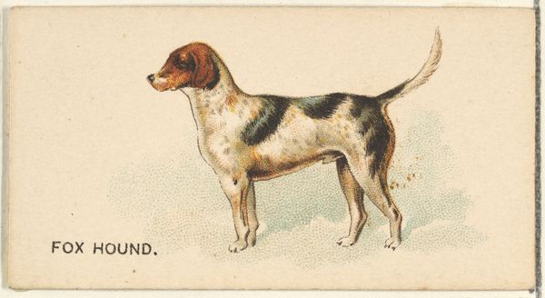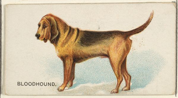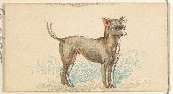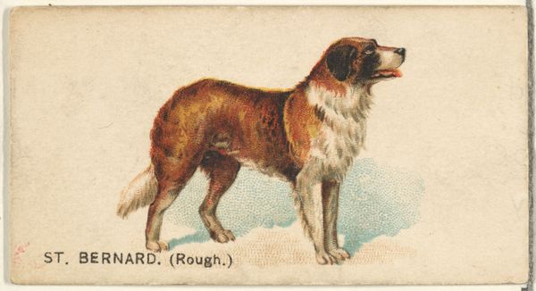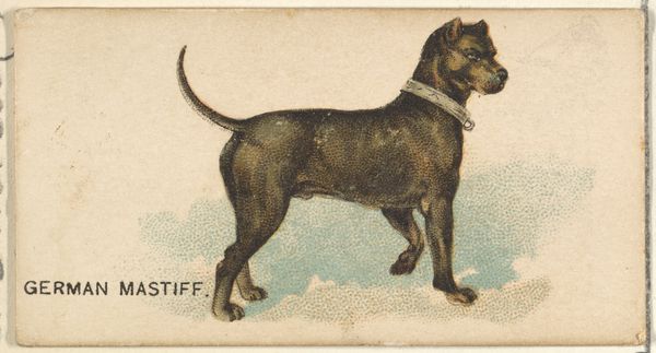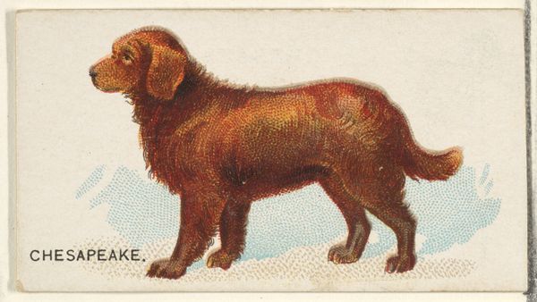 Curator: There's a wistful quality to this little fellow, wouldn't you say? Sort of a gentle, observant sadness. Editor: Goodwin & Company produced this artwork, a print, circa 1890, called "Water Dog, from the Dogs of the World series for Old Judge Cigarettes," and today it resides at the Metropolitan Museum of Art in New York. But melancholy? Really? To me, he simply looks like he is posing for the picture. Curator: It's in the eyes. Look closely, you can see an acknowledgement of something just beyond the frame. It feels allegorical, almost, this "Water Dog" archetype, pulled from some long-forgotten fable. Water, of course, carries its own symbolism, often alluding to emotionality, purification. It all adds layers to this canine portrait. Editor: While I agree about water often carrying rich symbolism, I wonder if we're imbuing too much meaning onto what was likely just a piece of commercial ephemera? These types of prints were basically trading cards inserted into cigarette packs. Their function was primarily promotional, driving sales of tobacco products. They likely didn't overthink it beyond selling product. Curator: Perhaps, but even within those constraints, symbols creep in. The "Dogs of the World" – what does that imply about the late 19th century, this impulse to classify, catalogue, possess knowledge about all corners of the Earth, reflected even in cigarette cards? And the "Water Dog"—specifically, does this animal embody certain traits attributed to dogs or our shared cultural concept of water? Editor: That's interesting - viewing these cards not as isolated images but part of a larger project of knowledge. Given their mass distribution, they certainly participated in shaping a shared, if sometimes superficial, understanding of the world. "Water Dog" likely evokes loyalty, strength, perhaps the taming of nature, considering their working roles such as retrieving ducks, which resonates with the era's values. Curator: Exactly! These aren’t random images, and those values subtly get reified. Editor: Point taken! Looking closer, the coloured pencil work, somewhat impressionistic in its loose strokes, almost imbues the dog with a hazy dreaminess that invites imaginative associations rather than a concrete reading. Well, I think my skepticism has softened somewhat. Curator: It’s fascinating to see how such seemingly simple image still holds meaning for contemporary viewers. Editor: Yes. A little canine philosopher from the 19th century!