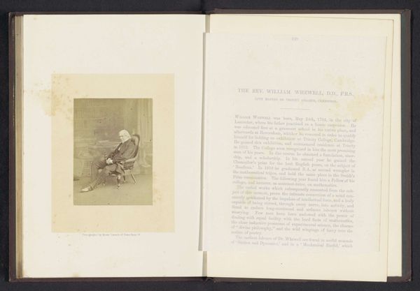 Editor: Here we have "Portret van George Biddell Airy" by Ernest Edwards, dated before 1868. It looks like an old photograph pasted into what appears to be a personal journal or scrapbook. It strikes me as quite formal, very buttoned up. What can you tell me about this piece? Curator: Focusing on its inherent structure, we see a diptych format, a common structural choice for personal albums. On one side, we have a portrait, a rectangle within the larger rectangle, drawing the eye inward with its contrast. On the other, a block of text. What do you notice about the textures at play? Editor: The photograph seems to be fading a bit, adding to the antiquated feel. The aged paper has these interesting discoloration patterns. It creates an overall tone reminiscent of old libraries. Curator: Precisely! Now consider the composition of the photograph itself. The subject is positioned slightly off-center, drawing our eye along a diagonal. How does the composition within the photo work with that broader juxtaposition against the block of text on the facing page? Editor: I see what you mean. It feels very balanced, with the photograph of a man offset by that very imposing block of text. I wonder why the artist chose to frame the photograph within this album. Curator: We can only speculate, but observe the interplay between the visual and the textual. The photograph presents an image, the text a narrative. Does one elucidate the other, or do they function independently, offering complementary facets of a single subject? Editor: That's an interesting point. Seeing them side-by-side like that emphasizes both the visual and textual elements and encourages interpretation. I never thought about that, seeing them in relation to each other. Curator: Precisely! The dialectic is crucial here; it invites a deeper contemplation of form and content.