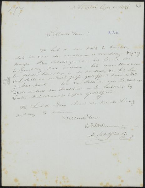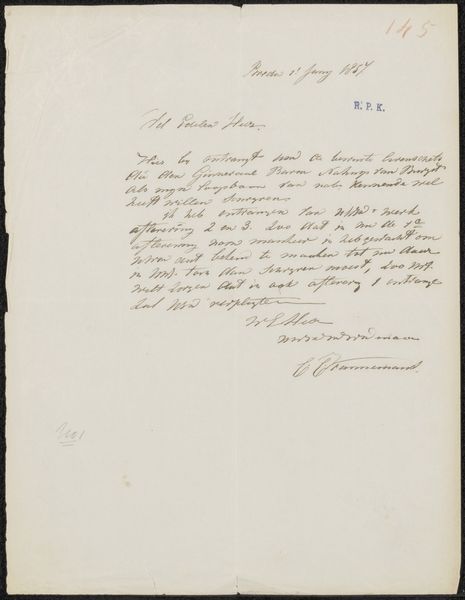 Curator: This piece, "Brief aan Frans Buffa en Zonen" by Jacobus Ludovicus Cornet, made around 1873-1874 using pen, ink and mixed media on paper, it's quite interesting, don't you think? Editor: Yes, the handwriting is elegant, almost like an artwork itself. I wonder, what strikes you most about it? Curator: What’s fascinating is the labor involved. Think about the act of writing this letter, the time spent carefully forming each character with ink and pen. The materiality of paper, the specific ink used—these details speak volumes about the communication of the time. This was a crafted object intended for consumption. Editor: That's true; the penmanship seems crucial to its function. Curator: Precisely. And who were Frans Buffa and Sons? Likely art dealers or publishers. This letter represents a transaction, a material exchange within the art world ecosystem of the late 19th century. Consider the social context - how did this communication function within that society? How much weight did a physical letter hold in their time, versus how we casually send an email today? Editor: It seems to hold far more significance because of the time and labour spent. This tangible nature emphasizes the importance the parties attached to this correspondence. Curator: Indeed. It blurs the lines between functional document and art object. Was Cornet just conveying information, or was he consciously creating something aesthetically pleasing? Where is the boundary between labor and creation here? Editor: I never really thought about a letter in this way, it truly becomes a testament of effort! Curator: These small interactions reveal so much when we look at the art world as part of a bigger manufacturing machine. Thanks for sharing your fresh perspective, it makes you wonder about value. Editor: Likewise, the exchange shows me how we could view historical texts beyond content and meaning, which opens new directions of interpretation.