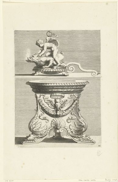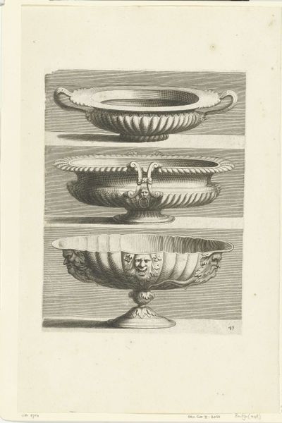 Françoise Bouzonnet created this print of two basins sometime in the 17th century. It is an etching, meaning that the image was incised into a metal plate, likely copper, using acid. Consider the skill involved. The etcher would have to work with absolute precision, moving their tools to create lines that hold ink. This is not the spontaneous gesture of a sketch, but careful, controlled labour. The final print is also produced through a labour-intensive process, pressing paper against the inked plate. Prints like this one allowed designs to be disseminated widely, influencing the production of luxury goods across Europe. The image is meant to be instructive. We see classical motifs and the satyrs at the base, with a shell motif, all rendered as though from metal. Such prints were used by silversmiths and other artisans as guides for their own creations. So while this artwork is "just" a print, it played a crucial role in shaping the material world of its time. It reminds us that the division between design, craft, and art is a modern invention.
