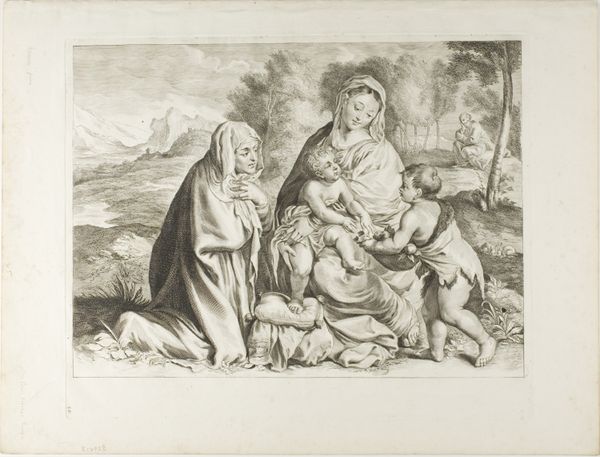 Jean-Baptiste Nolin created this engraving, "Holy Family with John the Baptist," in the late 17th or early 18th century, a period marked by strict social hierarchies and religious norms. The image presents an idealized version of motherhood and family, characteristic of its time. Mary is depicted as serene and nurturing, while Joseph embodies patriarchal stability. Yet, this very presentation raises questions about the lived realities of women and families then. How does this polished image align with the experiences of women, especially those outside the privileged classes? The inclusion of John the Baptist adds a layer of religious and historical context, further embedding the artwork in the dominant religious narratives of the time. Does this depiction reinforce traditional roles, or does it offer a glimpse into alternative narratives of familial and spiritual connection? Ultimately, this engraving invites us to reflect on the complex interplay between representation and reality, faith and identity, in a world undergoing profound social and cultural change.