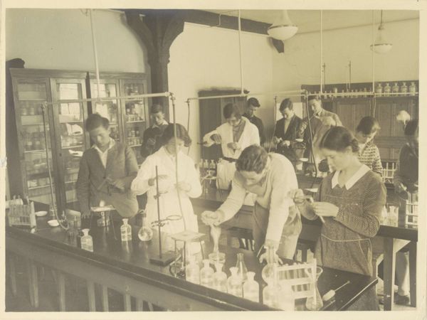 Editor: This gelatin silver print, "Technische afdeeling," captured by Atelier Kurkdjian between 1931 and 1934, depicts an office interior filled with men hard at work. There’s a rather striking use of light and shadow; it gives the composition a formal, almost staged feeling despite the candid subject. How do you see this photograph working formally? Curator: The formal elements within "Technische afdeeling" suggest a highly structured environment, both within the depicted space and in its compositional arrangement. Note how the photograph's geometric architecture of the room, with its grid-like windows and orthogonal desk arrangements, creates a strong sense of order. Do you observe any disruptive element that introduces visual interest? Editor: Well, yes! The positioning of the figures. They're not uniformly distributed but rather arranged in small clusters, disrupting the strict geometry. The tonal range seems limited; the subtle variations of gray contribute to the visual rhythm. Curator: Precisely! These human elements create subtle visual stresses and deviations. These localized areas draw the viewer’s eye across the composition. Furthermore, the lighting, likely artificial, sculpts the space and delineates forms. This focused illumination enhances the textures of the papers, furniture, and clothing. It is also very interesting how the orthogonal structures generate receding parallels within the picture frame and induce a sensation of spatial depth. Editor: So, by examining the arrangement of space, figures, light, and tone, one could infer the intended structure and control within the "Technische afdeeling"? I hadn't thought about the connection to a controlling structure so explicitly, only more informally as depicting office work and organisation. Curator: Exactly! And by further studying the relations between all formal components, more intricate implications arise. It is through these precise interactions that the photography can engage the viewer.