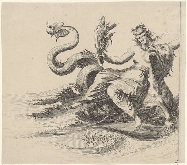 Editor: This is Antonio Tempesta's "A Lion Attacking a Supine Horse," created around the late 16th century. It's a small engraving, only about 3 by 5 inches. The scene is quite violent, but what strikes me is the positioning of the figures. What do you see in the composition? Curator: The formal arrangement presents a study in contrasts. Note the dynamic diagonal created by the bodies, juxtaposed against the static background. The meticulous detail of the engraving technique heightens the tension through textural differentiation; consider the lion's mane versus the horse's smooth flank. Do you see how the artist uses line weight to create depth? Editor: Yes, the darker lines definitely bring the foreground forward. It's interesting how much drama he creates with such simple means. I'll have to look more closely at the line work in other engravings. Curator: Indeed. The artist has created a compelling and tense work, using simple and classical forms.