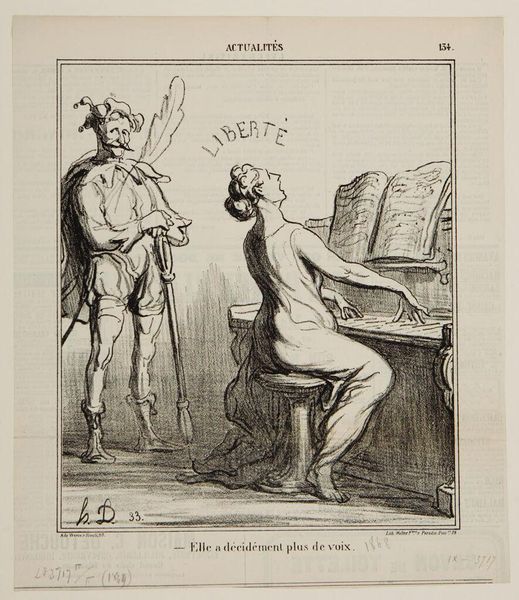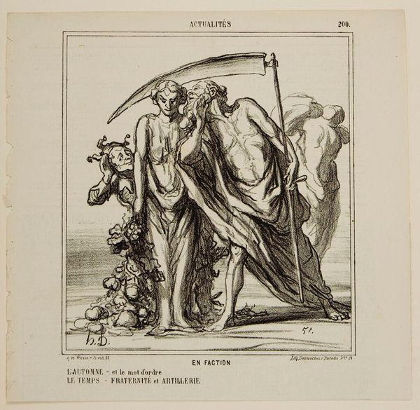 Curator: This lithograph is by Honoré Daumier, titled "Pardon me, my dear...", part of his series called "Actualités". Editor: Gosh, it's got such a wonderfully chaotic energy. The lines feel so alive, like it's all about to burst off the page. Curator: Indeed, Daumier masterfully employs caricature to critique power dynamics. The central figures represent Liberty and, what appears to be, a figure symbolizing the wine industry. Editor: Liberty looks like she's putting someone in their place, with a look that could kill! I wonder what the wine guy did to deserve it? Curator: Given Daumier's social commentary, it is likely a commentary on the economic and political interplay of the time. Editor: Well, I feel educated and entertained! A winning combo.