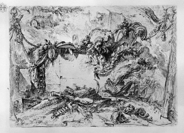 Giovanni Battista Piranesi made this etching, “Caprice decoration: a skeletal figure in the center, among the ruins, fragments of sculpture, bones and skulls of which one half of the first floor,” some time in the mid-18th century. In this work, Piranesi, an Italian artist celebrated for his architectural fantasies, presents us with a scene teeming with the relics of a bygone era. The scattered bones and crumbling sculptures serve as potent symbols of mortality and the ephemeral nature of human achievement. Made during the height of the Grand Tour, when wealthy Europeans flocked to Italy to study its classical past, Piranesi’s ruins speak to the prevailing fascination with history. Yet, they also hint at a more profound commentary on the transience of power and glory. By juxtaposing these remnants with the stark reality of death, Piranesi invites us to contemplate the cyclical nature of civilization. To fully appreciate Piranesi's work, we need to consider the socio-political context in which it was created. Exploring travel journals, architectural treatises, and archaeological reports from the period will give us a better appreciation of this artwork.