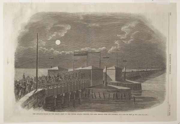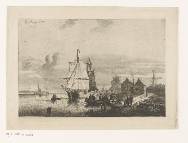 Curator: This engraving by Jacob van Meurs, made around 1663-1664, offers a "View of the Old Inn in Amsterdam." There is a stark precision in the lines, isn't there? Editor: Indeed. My first impression is one of bustling commercial life; the mood is energetic. Look at all the activity converging at this inn! Curator: Let's consider the process behind such detail. The burin, or engraving tool, was pushed across a copper plate. That is some deliberate and precise labor! It begs the question of who the print was for, and who consumed these images of Amsterdam's waterfront. Editor: Exactly! Images like this help us to understand Dutch society during its Golden Age, to see how public life and commercial enterprise literally met on the docks. Notice, for instance, how social classes interact on that bridge. Curator: Observe the depiction of labor; people offloading barrels, passengers boarding boats, what story of production does the level of detail tell? Are we meant to view the social impact and organization of it all? Editor: Definitely. And don't overlook the implied presence of international trade and colonization. All these boats suggest wealth extracted from elsewhere, flowing into Amsterdam and financing these scenes of daily life. I wonder how that reality complicates this picturesque view? Curator: That's a crucial point. It asks us to question not just what we see, but what's strategically omitted. In terms of materiality, how does a medium like print shape its message? Editor: I find it significant. Print allowed wider distribution of the image, standardizing how Amsterdam presented itself to the world. Consider what narratives were privileged during this historical moment! Curator: An impressive technical achievement in representing a booming era. One cannot but observe the materiality with which early modern globalization occurred in this scene. Editor: And for me, it prompts deeper inquiry into the social forces driving and shaped by that bustling exchange; forces whose consequences resonate still.