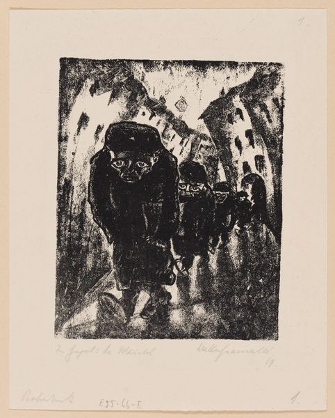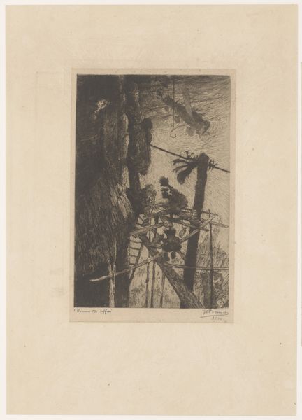 Curator: Pieter de Josselin de Jong created this etching, entitled "Mijnarbeider met bloot bovenlijf" – "Mine worker with bare torso" – around 1895. It's part of the Rijksmuseum's collection. The artist used the etching technique on paper. It's incredibly evocative, isn't it? Editor: Woah, claustrophobia central! It’s stark and heavy, all grays and blacks, but that single light source really draws the eye. You feel like you're peering into some hidden, oppressive world. Curator: The dramatic chiaroscuro really underscores the themes of labor and hardship, typical of genre painting. The almost heroic representation of the worker also places it within the artistic exploration of social realism and, possibly, the burgeoning worker’s movement then gaining momentum. Notice the posture. Editor: Right? Shoulders hunched, muscles straining… You can practically feel the weight of the pickaxe and the dampness of the mine. He's literally wrestling something out of the earth. Almost biblical in the struggle, really. It's both intimate and impersonal. Curator: Yes! Consider, also, the psychological weight of his bare torso: is it intended to show the miner's physical strength, or vulnerability? Or is the near-darkness designed to communicate the constant threats that were part of that world and time? It reminds one of the stoic images of labour from, say, Courbet, yet imbued with its own stark vision of 19th-century labour. Editor: It feels like an old photograph bleached by time, whispering secrets. Makes you wonder about all the invisible hands that built our world. Sort of like that feeling you get when wandering old castles or factories - ghosts of human endeavor swirling around. Curator: Precisely. Through his artistry, de Josselin de Jong invites us to meditate on the human cost of industry, power, and survival. Editor: It really leaves a lingering ache. The kind you feel in your bones, long after you've moved on to the next artwork. A memory dug up from the depths, really.