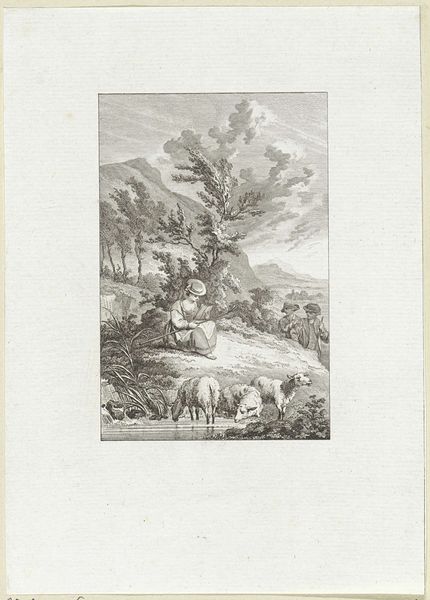Editor: So, this is "Rocky Landscape in Styria, a man with a mule on the left," a pen and ink drawing by Ernst Willem Jan Bagelaar, dating to 1819. It's incredible how much detail he achieved with such simple materials! I'm immediately drawn to the contrasting textures and the sheer scale suggested. How would you interpret this work, looking at its formal qualities? Curator: The immediate observation lies in the clear dichotomy between the smooth washes of ink suggesting distance and the sharp, decisive lines defining the rocky foreground. This contrast isn't merely representational; it structures the visual experience, pushing and pulling the eye through space. Note how Bagelaar employs a limited palette – the gradations of monochrome creating depth and volume. Does this disciplined approach remind you of any other landscape traditions? Editor: I'm thinking of early topographical surveys, but this seems more… romantic. Curator: Precisely. The artist isn't just mapping space; he is constructing a visual argument about space and experience. The strategic placement of light and shadow—observe how the sun appears to strike the upper reaches of the mountain, leaving the foreground in shade—creates a sense of drama and perhaps even the sublime. Editor: It almost feels stage-like, now that you mention it. The human and mule become a scale reference in this vast composition. Curator: The scale is not just perceived; it's actively created through compositional choices. By emphasizing verticality with the stark, leafless tree against the rising peaks, he underscores nature’s dominating presence. It makes you ponder, doesn't it, on the ability of lines to not merely depict but to embody an experience. Editor: It definitely gives a different perspective, thinking of how lines and shadows build the emotional scale. Thank you! Curator: My pleasure. It's through that close looking that art reveals its deeper, structural truths.