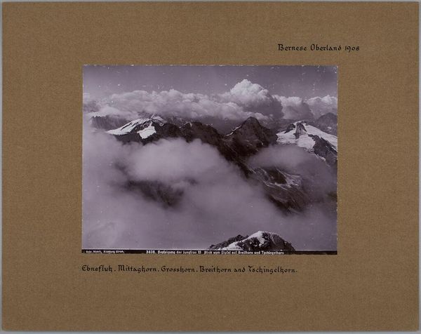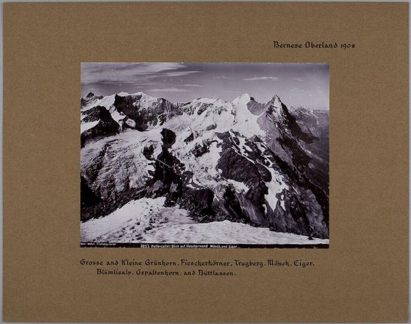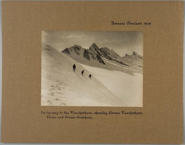 Editor: This photograph, "The Summit of the Wellenkuppe, Pennine Alps," captures a group of climbers against a vast, snow-covered landscape. It feels very much like a romanticized portrayal of conquering nature. What historical narratives do you think this image speaks to? Curator: It certainly evokes ideas of exploration and dominance, reflecting the era's imperialistic ambitions. Images like these, widely circulated, contributed to a cultural narrative of man versus nature, reinforcing ideas of progress and control through exploration. Do you see any connection to that? Editor: I do! The image seems staged to highlight that sense of triumph. The climbers are tiny against the mountain, but they are there and reaching the top. Curator: Exactly. Understanding its circulation in the context of mountaineering's rise in popularity and its role in shaping national identity offers a deeper understanding. Editor: It's fascinating how a seemingly simple landscape photograph can be so deeply intertwined with cultural and political history. Curator: Indeed. It reminds us that images are never neutral; they always participate in larger conversations.
